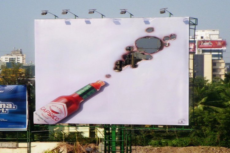 Capsico’s red pepper sauce blasting through the billboard. A straightforward but creative way to show how spicy and hot the sauce is, a burned hole is created to show its effect.