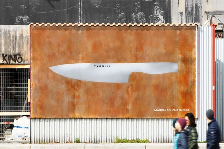 Heimat designed a successful billboard for Tyrolit to prove that the Tyrolit knife will remain untarnished in the outside environment. The campaign started with just a sheet of metal with only Tyrolit’s logo on it but in a few weeks, the metal started to rust, revealing the shape of a knife on its stainless part. This ad has grabbed the attention of the passer-by and especially amazed those who witness its transformation every day. Now everyone knows that Tyrolit’s knife is stainless and will remain shiny as ever even in the outside environment.