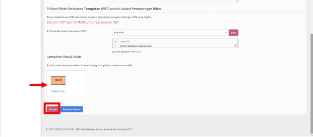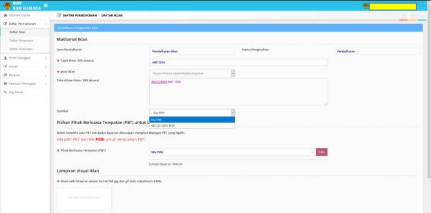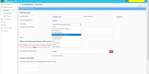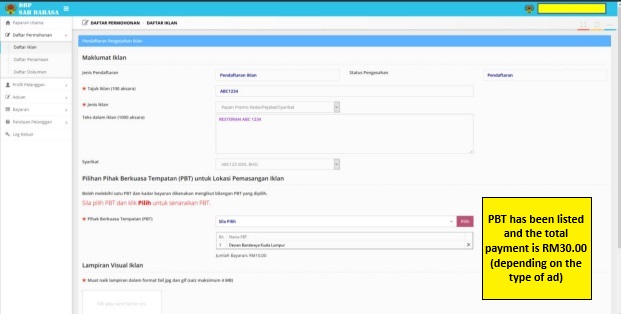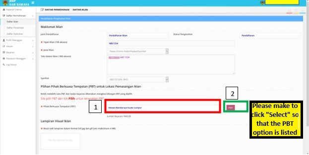 Step 5: Make sure the location is selected by the respective location's Majlis Bandaraya for the Local Authority Choice (PBT) for Advertisement Installation Locations. The rate for one PBT is RM30. You may select more than one if you need to advertise at multiple locations.